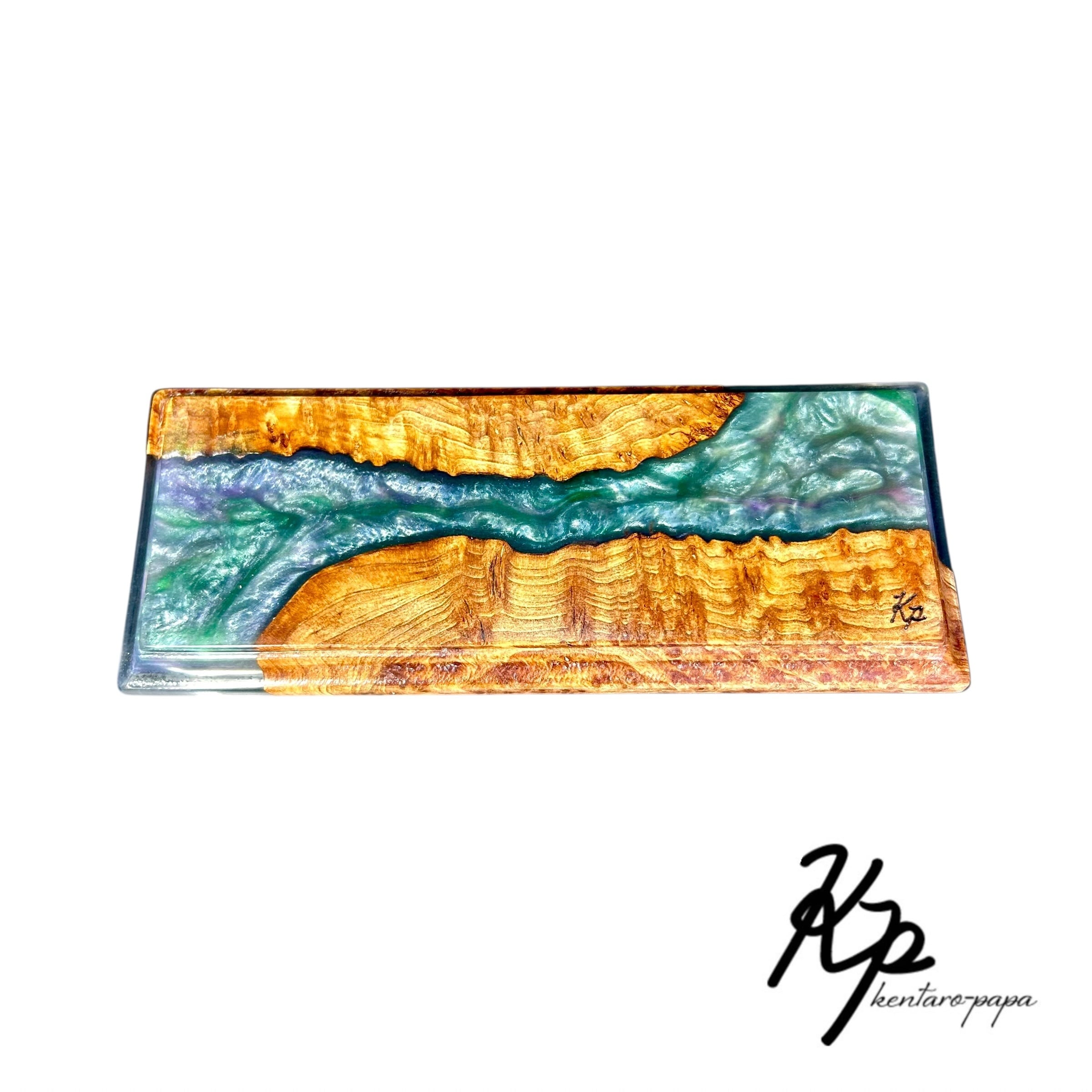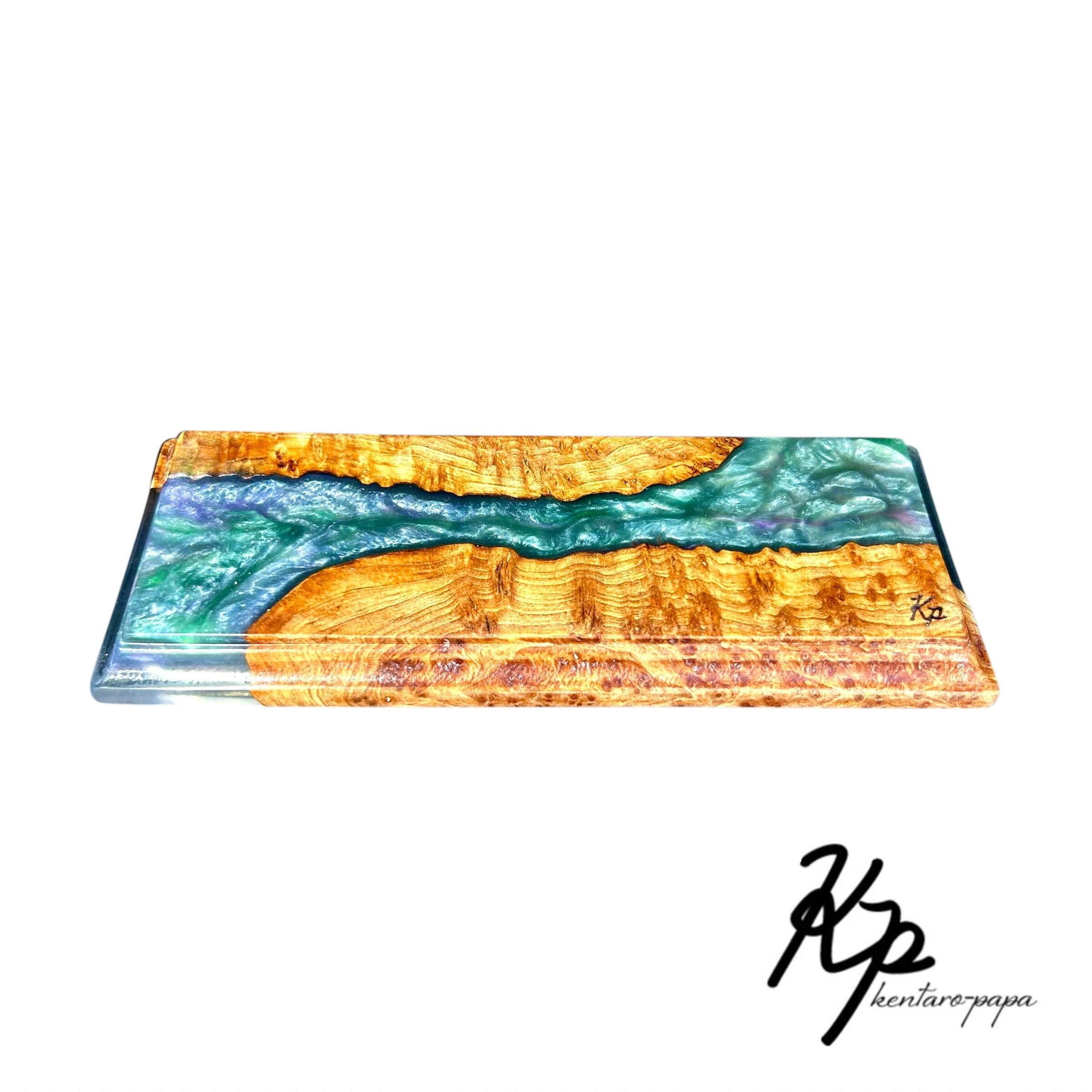 ランダイ杉の豊かな杢に、青から緑へと移ろうレジンを合わせたウッドレジントレイです。